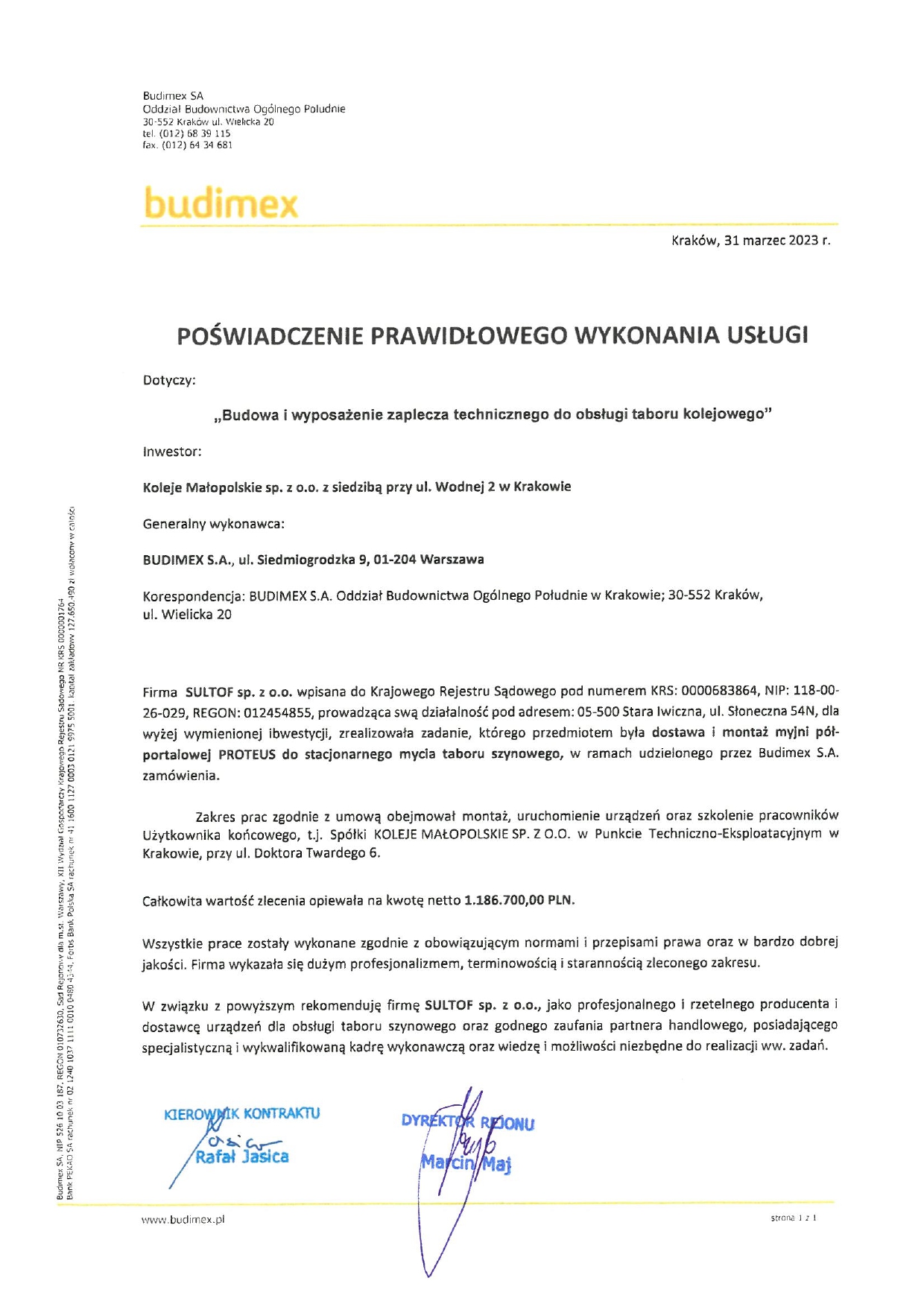 zakladu. Pracownicy Sultof sp. z o.o. wykazali się profesjonalizmem, fachowością oraz pomocą i
